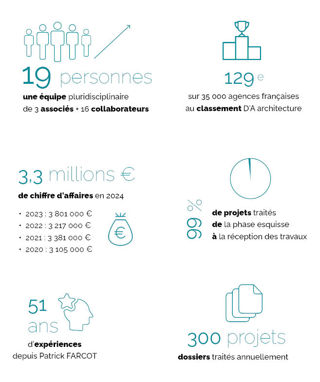 L’agence d’architecture FARCOT & ASSOCIES a un historique de 40 ans d’existence. Née de l’héritage du savoir-faire mis en place par Patrick FARCOT depuis plus de 40 ans. Julien GROSSET, Joffrey BONNAMY et Cédric ROSATO sont aujourd’hui architectes associés et collaborent depuis 15 ans. La structure actuelle est le fruit d’une longue collaboration basée sur la confiance, où chacun des trois associés a acquis une solide expérience professionnelle, et bénéficie d’une expertise due au crédit accordé par divers maîtres d’ouvrages (public et privé). L’agence est capable d’intervenir dans tous les domaines d’activités : logements, industriels, commerciaux, équipements et ERP, et maîtrise toutes les phases du projet ; des premières esquisses de conception jusqu’à la réception des ouvrages. Projets & réalisations dans les secteurs : INDUSTRIEL /// TERTIAIRE /// ERP COMMERCE /// LOGEMENT /// ETUDES CONCOURS /// CHANTIER