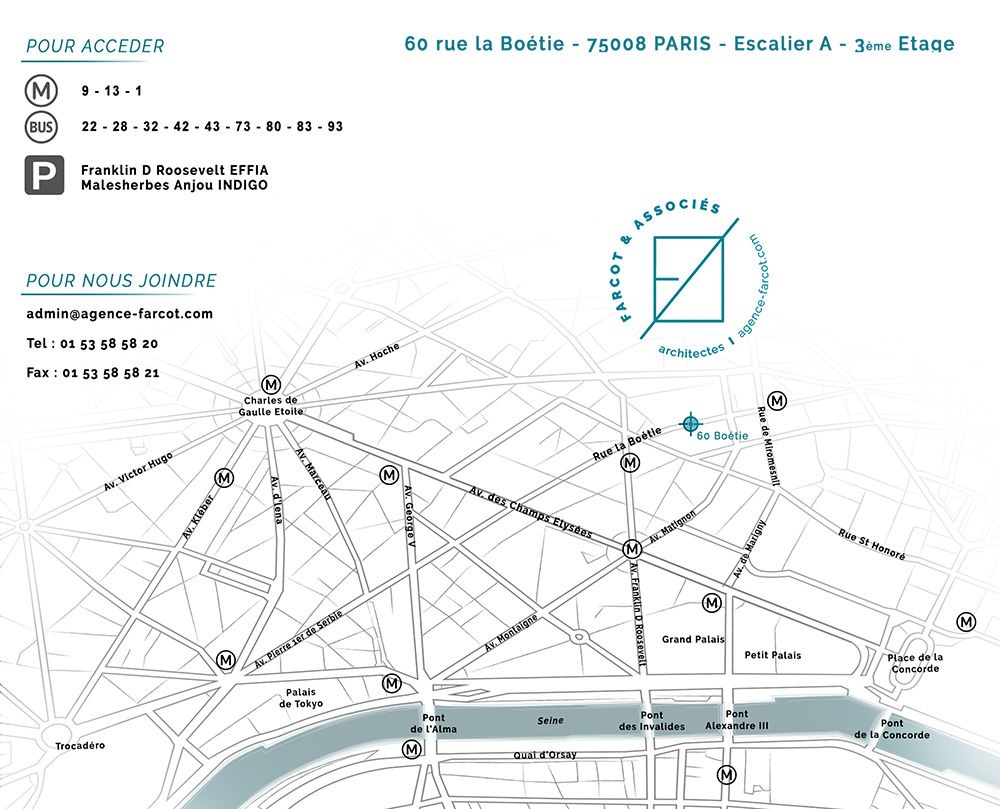 IMPLANTATION & RAYON D'ACTION L’agence est implantée à paris 8ème arrondissement au 60 rue de la Boétie, escalier A, 3ème étage. Elle est donc apte à travailler sur la région parisienne, voire à s’exporter sur tout autre terrain d’opération si nécessaire.