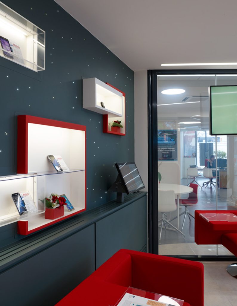 Le projet concerne la création d’une agence bancaire dans une coque brute au rdc d’un immeuble neuf dans la ZAC de Clichy Batignolles (l’un des premiers éco-coquartier de Paris) prévoyant l’aménagement intérieur, ainsi que le traitement de la façade vitrée (mur rideau) sur rues. Cette agence prototype a été l’occasion de mettre en oeuvre, des équipements et matériaux hors charte CIC : cloisons opacifiantes, parement Corian, mur LED. elle est constituée de 6 bureaux et d’une zone libre service. •