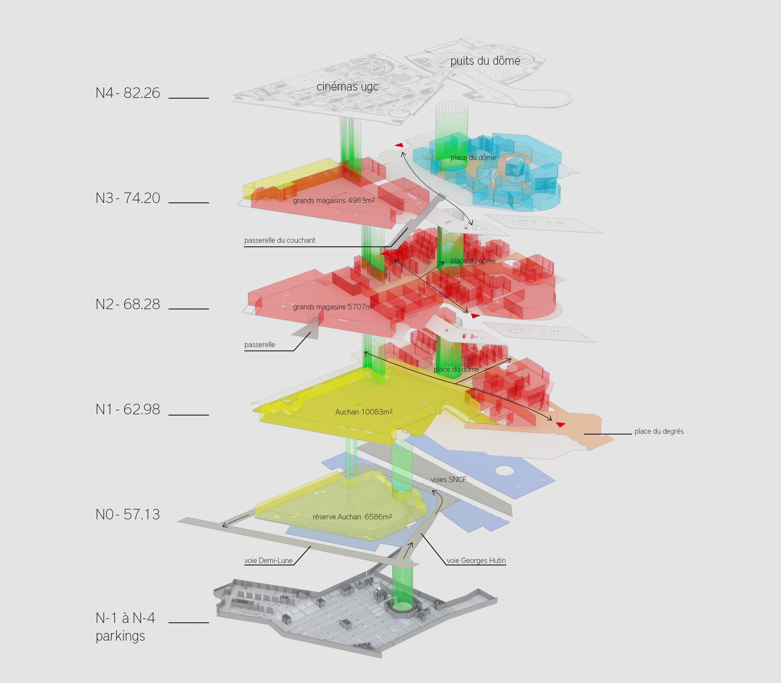 L’extension d’un centre commercial existant inscrit dans un site urbain dense et très contraint. L’étude menée porte sur la proposition d’une extension de l’équipement commercial en vue d’y développer sur plusieurs niveaux un ensemble d’activités liées à la restauration et aux loisirs. La réponse apportée est la création d’une enveloppe légère et transparente de forme organique, permettant de baigner l’ensemble des espaces intérieurs de lumière naturelle et de clarté. D’un point de vue urbain, le projet s’insère naturellement dans un espace mitoyen vide de construction et forme un repère architectural permettant de magnifier une nouvelle entrée orientée et ouverte sur l’espace publique de la ville mitoyenne. Le projet intègre également la requalification et la mise en connexion des espaces existants (mails, circulations, boutiques, équipements….). •