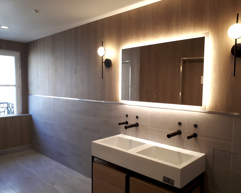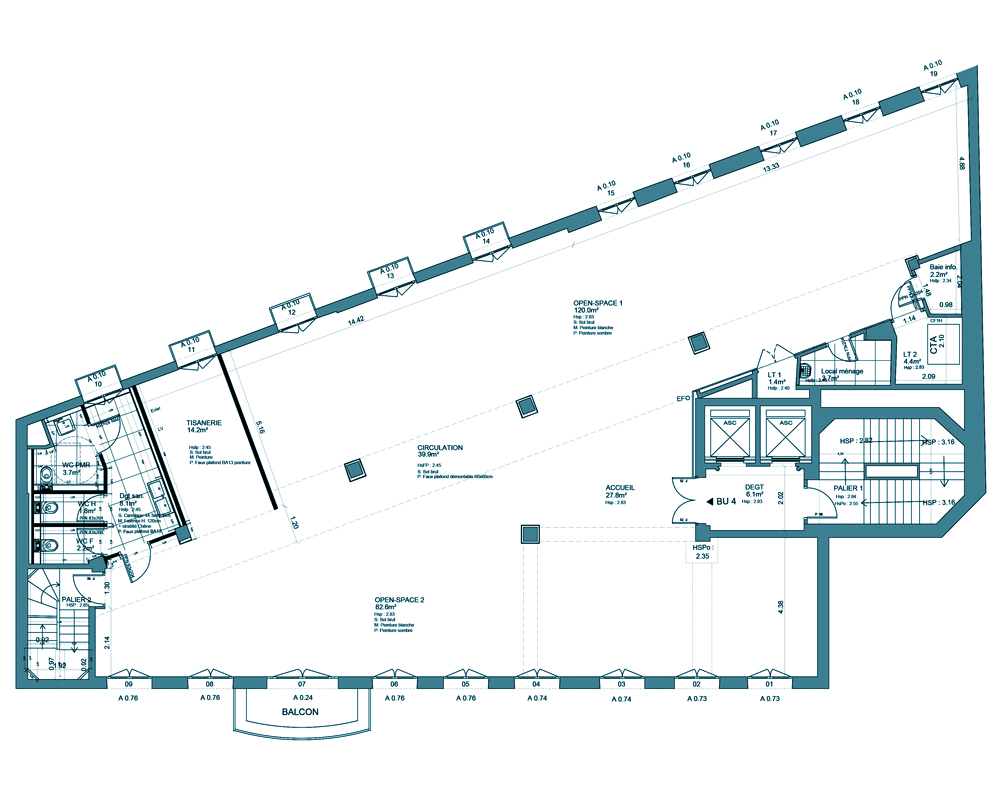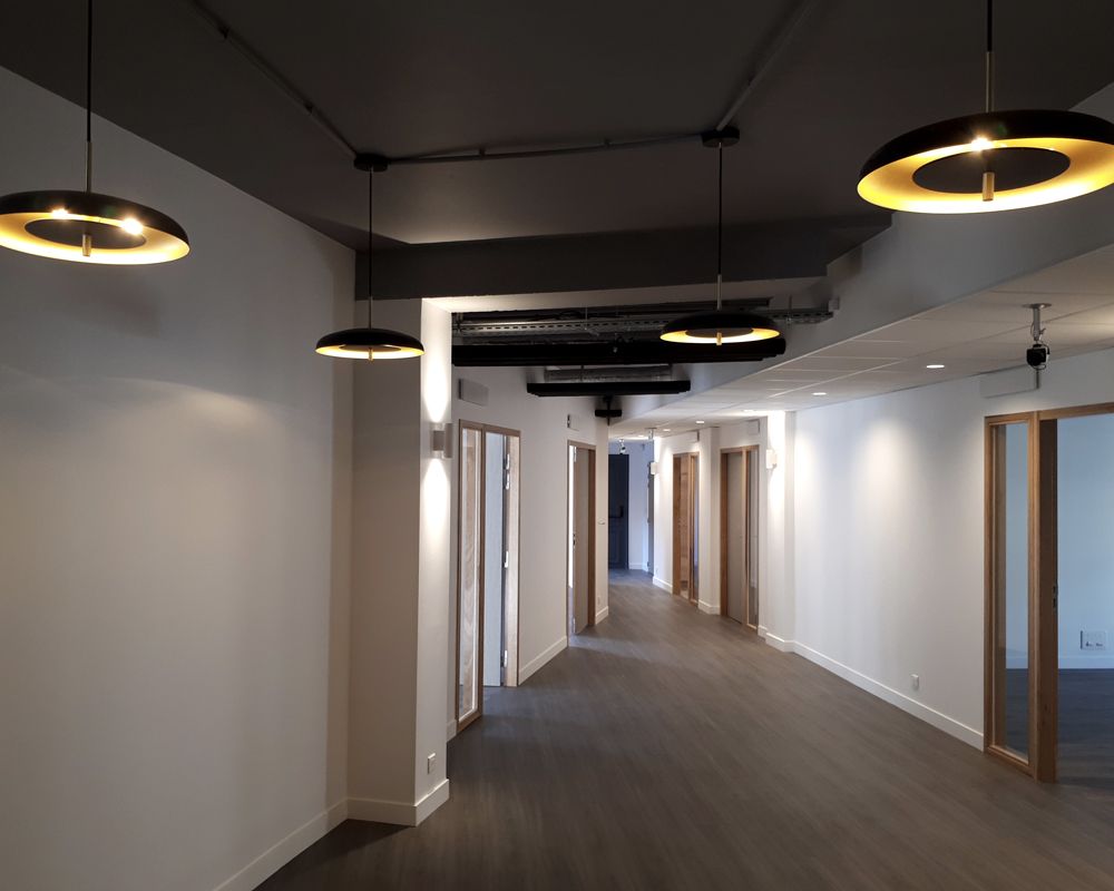 Réaménagement d’un plateau de bureau suivant la charte Youfirst de GECINA, intégrant des placages bois, un éclairage architectural avec des spots orientables sur rails suspendus, un traitement acoustique avec des panneaux suspendus, des couleurs franches et des plafonds ouverts en lie de vin, pour un espace ouvert, modulable et facilement transformable suivant les usages et besoins du preneur.