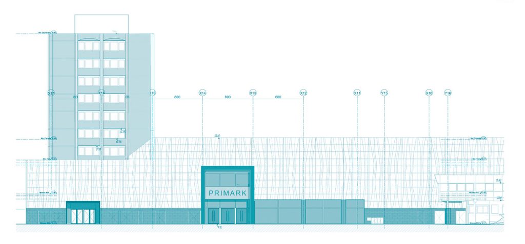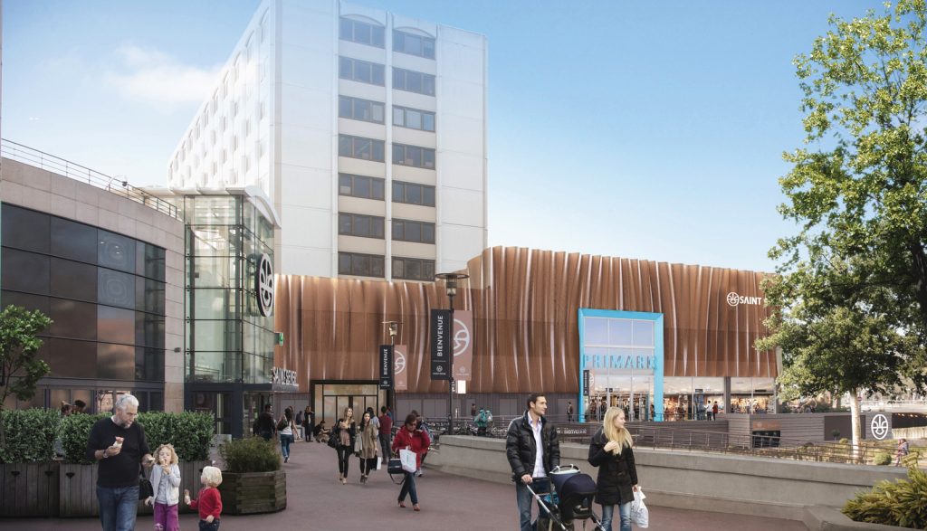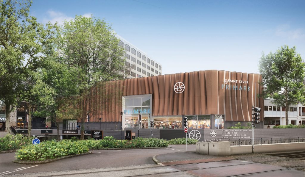 Les travaux, divisés en 3 phases distinctes, consistent à la rénovation du mail du centre commercial Saint Sever ainsi que de la restructuration du théâtre Duchamp-Villon à Rouen. Ce dernier sera lié au centre et pourra acceuillir de nouvelles activités commerciales. • Le théâtre s’est vu habillé d’un revêtement qui imite un grand rideau d’opéra, composé d’un assemblage complexe de caisson recouvert de maille métallique couleur bronze qui donne au lieu une apparence évanescente.