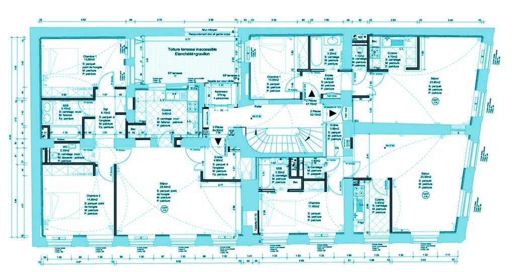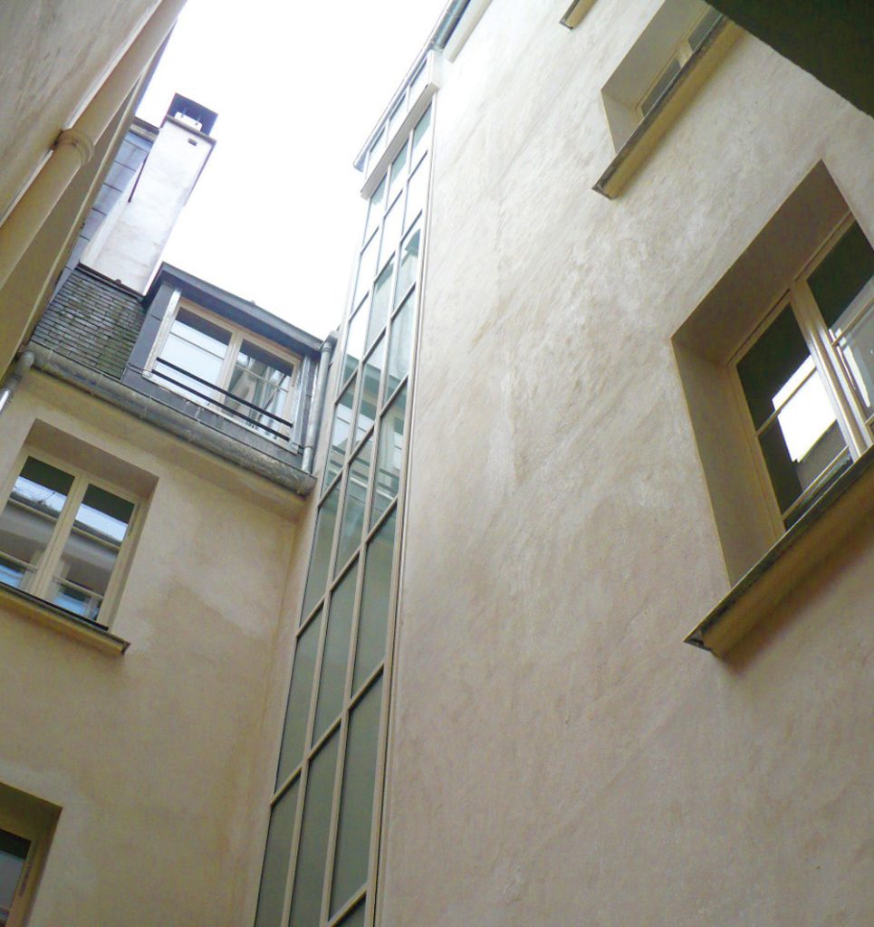 Réhabilitation lourde d’un immeuble ancien R+6 sur un niveau de sous-sol. Curage de l’ensemble du bâtiment, reprise des planchers y compris traitements acoustiques, création d’une gaine d’ascenseur, ravalement des façades sur cour, modification des lucarnes, création de châssis de toit. Aménagement de 14 logements répartis en 9 T2, 4 T3 et 1 T4 en duplex. Prestation de standing, appartements destinés àla vente. En RDC livraison de 3 coques brutes. •